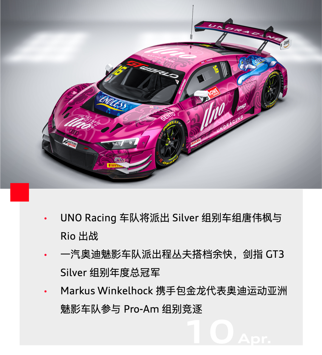 سينضم فريق UNO Racing إلى فرق FAW-Audi وAudi Sport Asia Phantom التي تم الإعلان عنها سابقًا في بطولة GT World Challenge Asia 2025 التي تقدمها AWS على مدار العام. يشكل تانغ ويفينج، العضو السابق في برنامج تطوير السائقين الشباب والذي يقود سيارات سباق أودي منذ فترة طويلة، والسائق الشاب الموهوب ريو تشكيلة قوية لفريق UNO Racing وسيشنان هجومًا على البطولة السنوية للفئة الفضية. وفي الوقت نفسه، سيشارك السائقون الثلاثة الرسميون لفريق Audi Sport Asia الذين تم الإعلان عنهم مسبقًا لموسم 2025 أيضًا في سلسلة GT3 متعددة العلامات التجارية الرائدة في المنطقة للتنافس على لقب البطولة. ومن المقرر أن تنطلق منافسات السباق الأول في الفترة من 11 إلى 13 أبريل/نيسان على حلبة سيبانغ الدولية في ماليزيا والتي يبلغ طولها 5.54 كيلومتر.