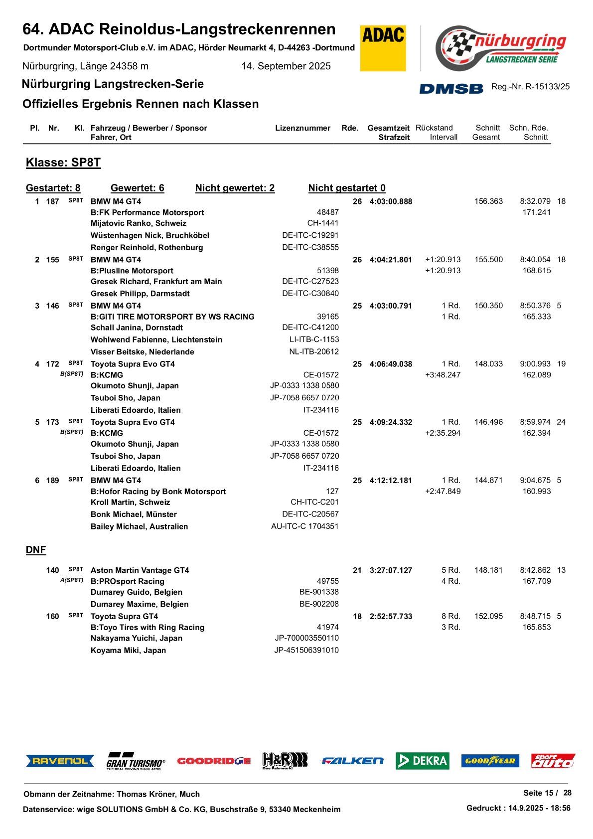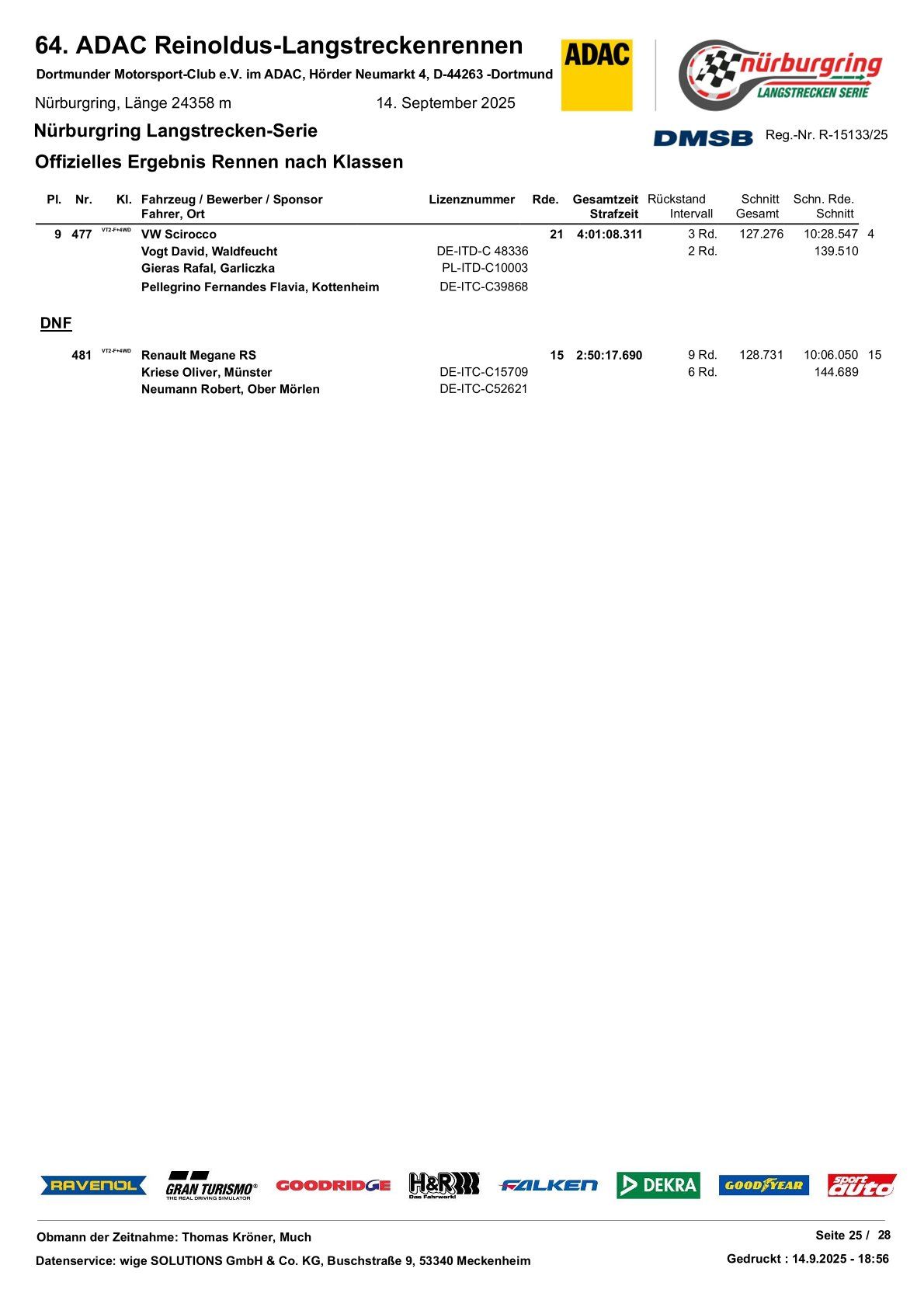 - TCR:Goroyan RT by Sharky-Racing 奥迪 RS3(777 号,Goroyan / Kvitka / Brink 车手)完成 25 圈,获得该组别冠军。