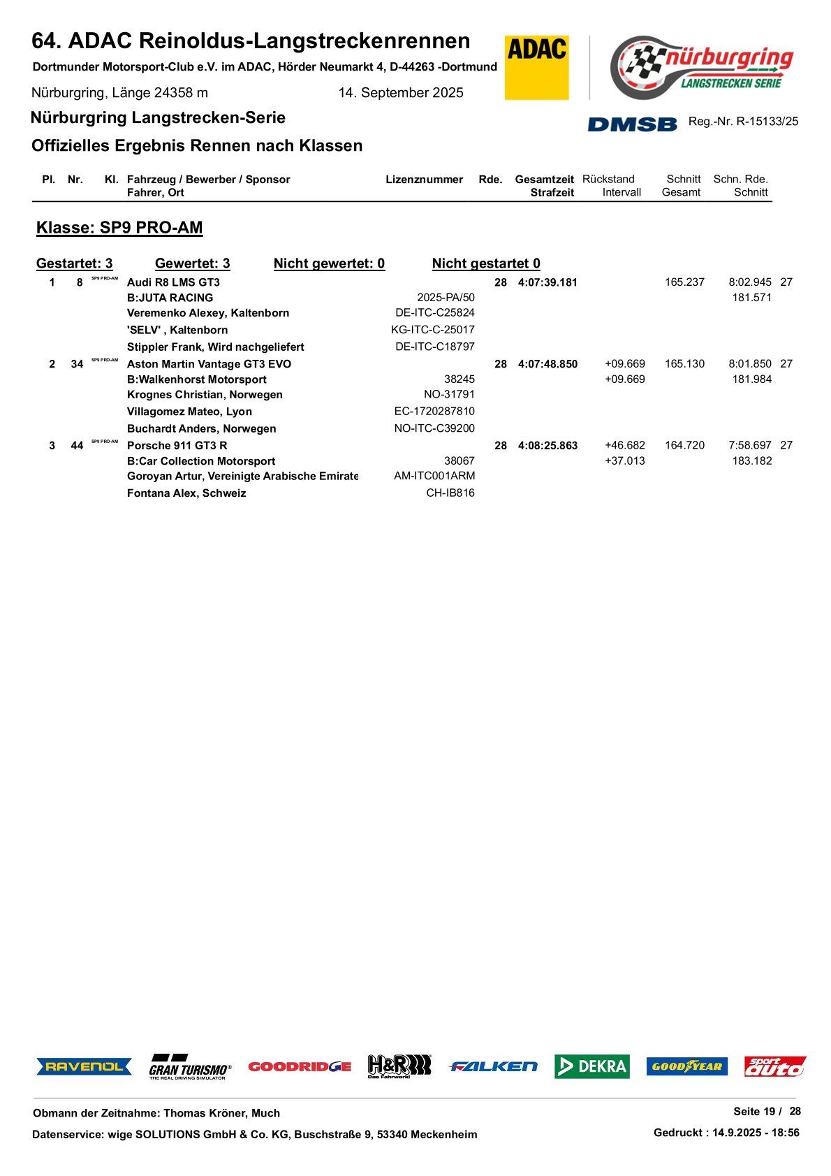 - SP9 PRO-AM:JUTA Racing 奥迪 R8 LMS GT3(8 号,Veremenko / “SELV” / Stippler)在 28 圈后以 4:07:39.181 的成绩夺冠,仅领先 Walkenhorst Motorsport 阿斯顿马丁 Vantage GT3 Evo 9.669 秒。Car Collection Motorsport 保时捷最终登上领奖台。