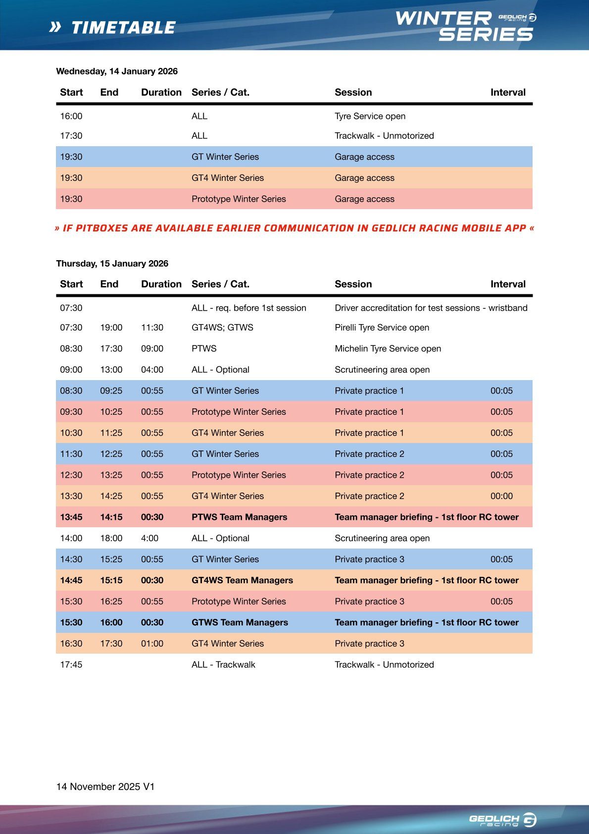 GT4 冬季系列赛将于周三晚间正式开幕。从 19:30 起,GT4 冬季系列赛车队可以进入维修区,卸载赛车和设备并开始技术准备工作。当天早些时候,轮胎服务将于 16:00 开放,随后是 17:30 的非机动赛道步行,以便车队初步熟悉赛道。