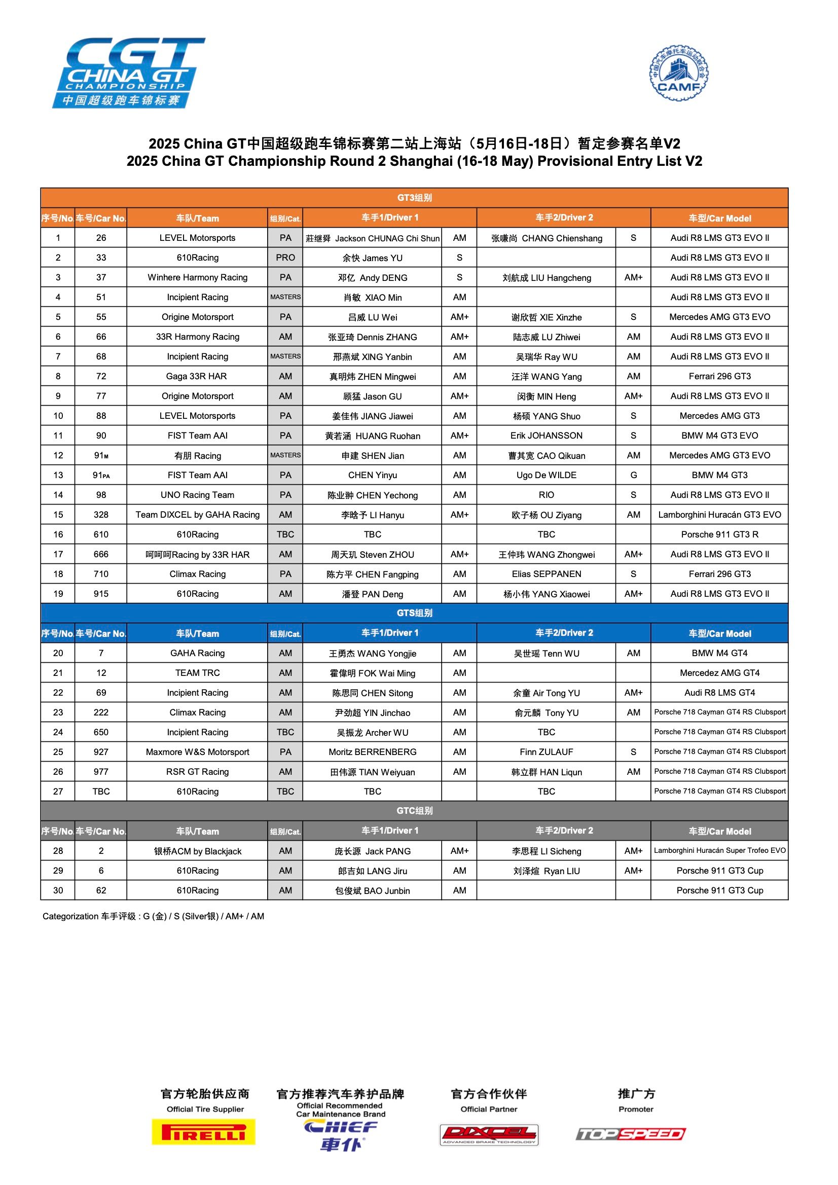 Toto je nejnovější předběžný seznam přihlášených (V2) pro druhou zastávku závodu China GT 2025 v Šanghaji (16.–18. května). Z tohoto seznamu vidíme, že zatím neexistuje žádný závodní jezdec Wang Yi...