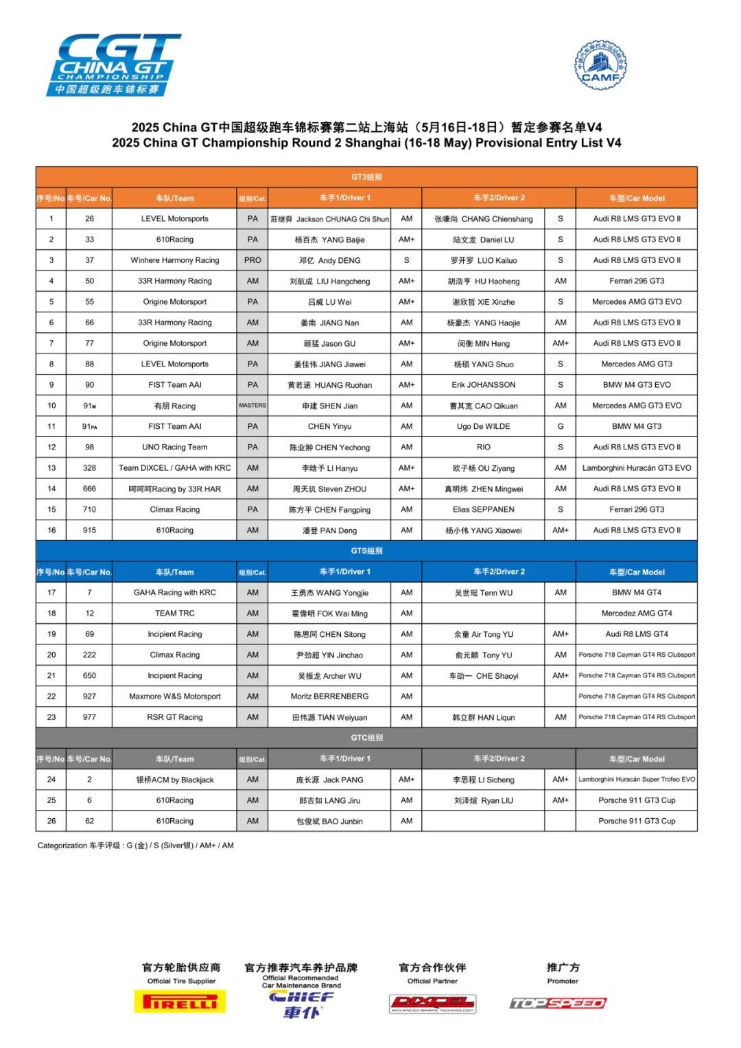 The Harmony Racing team also saw changes in the participating drivers in the multiple car groups: Winhere Harmony Racing's No. 37 car group will be challenged by two PRO drivers Deng Yi and Luo Kailuo; Liu Hangcheng will switch to the No. 50 car group of 33R Harmony Racing and form a partner with Hu Haoheng; two drivers active in touring car racing, Jiang Nan and Yang Haojie, will form 33R Harmony Racing The No. 66 car will compete in the China GT flagship category for the first time; the No. 666 car of Hehehe Racing by 33R HAR will be driven by Zhou Tianji and Zhen Mingwei.
