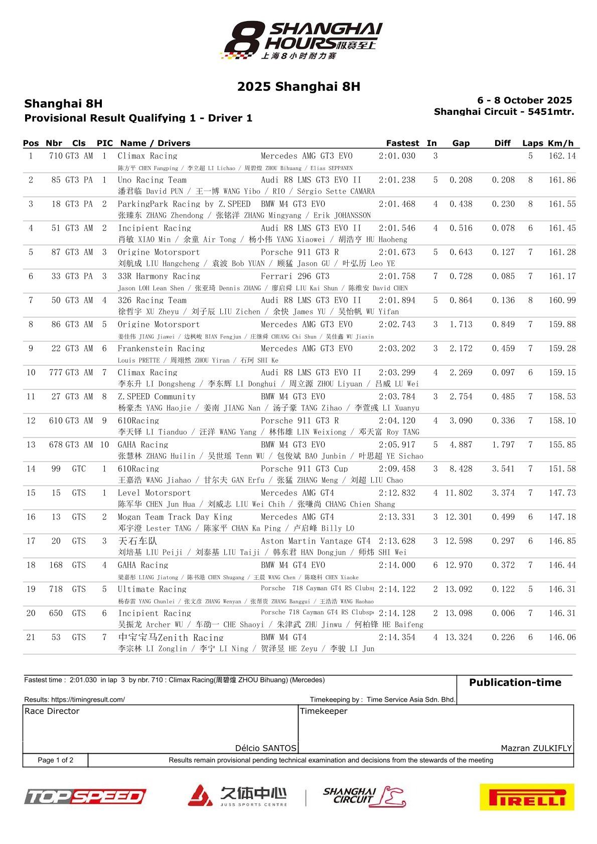 - 14:50 - 15:05: Shanghai 8 Hours Endurance Race, First Qualifying