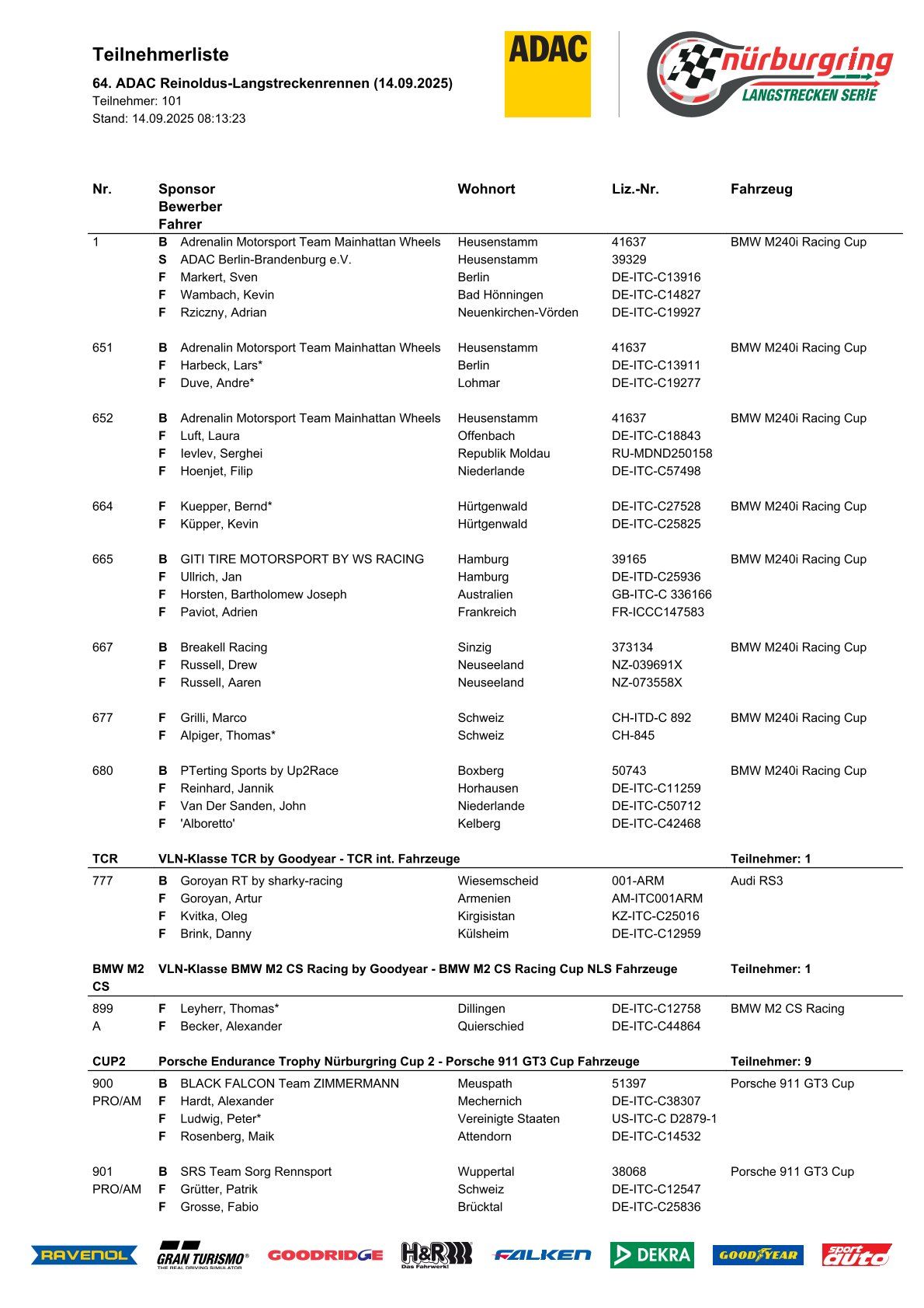 2025 NLS8 64th ADAC Reinoldus-Langstreckenrennen Descripción general de la lista oficial de inscritos