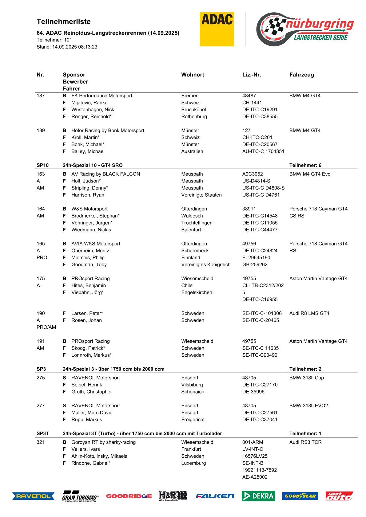 - AV Racing by BLACK FALCON, W&S Motorsport, AVIA W&S Motorsport y PROsport Racing inscriben Porsche 718 Cayman GT4 RS, BMW M4 GT4 Evo, Aston Martin Vantage GT4 y Audi R8 LMS GT4.