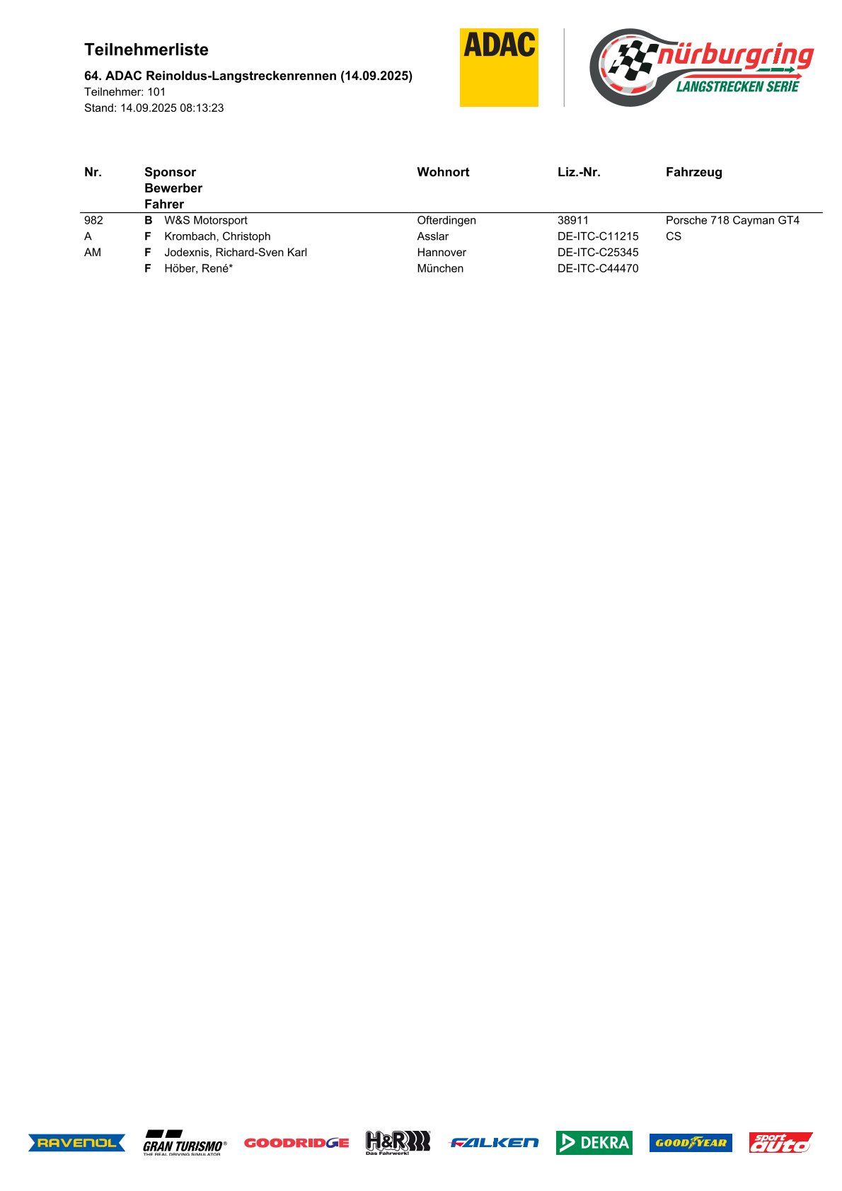 La 64.ª ADAC Reinoldus-Langstreckenrennen, que se celebrará el 14 de septiembre de 2025, confirma una lista de inscritos de 101 vehículos. Esta octava prueba de la Nürburgring Langstrecken-Serie (NLS) incluye las categorías GT3, GT4, Porsche Endurance Trophy, BMW Cups y turismos, lo que garantiza una gran diversidad en la parrilla.