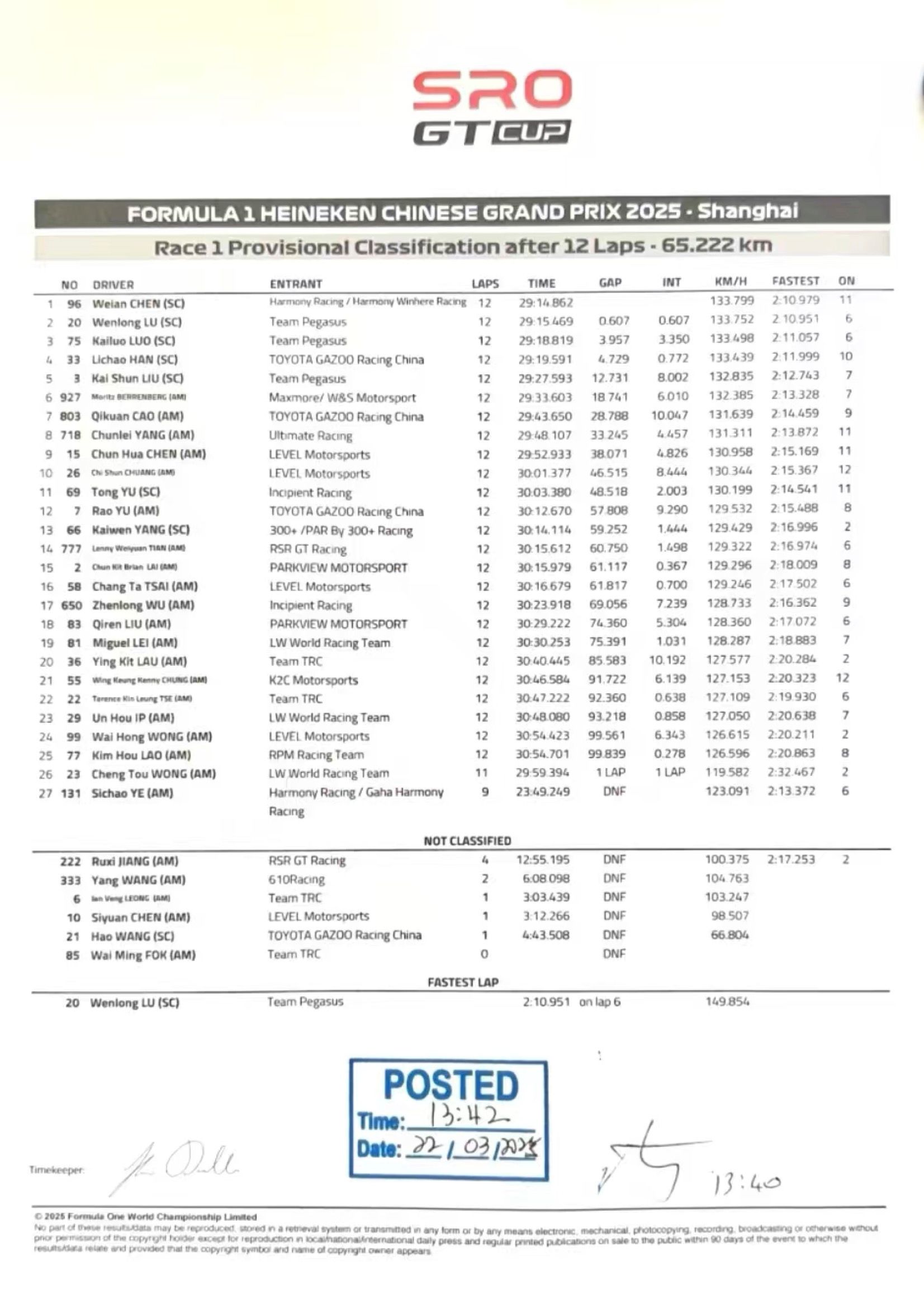 2025 एसआरओ जीटी कप शंघाई राउंड 1 और 2 के परिणाम