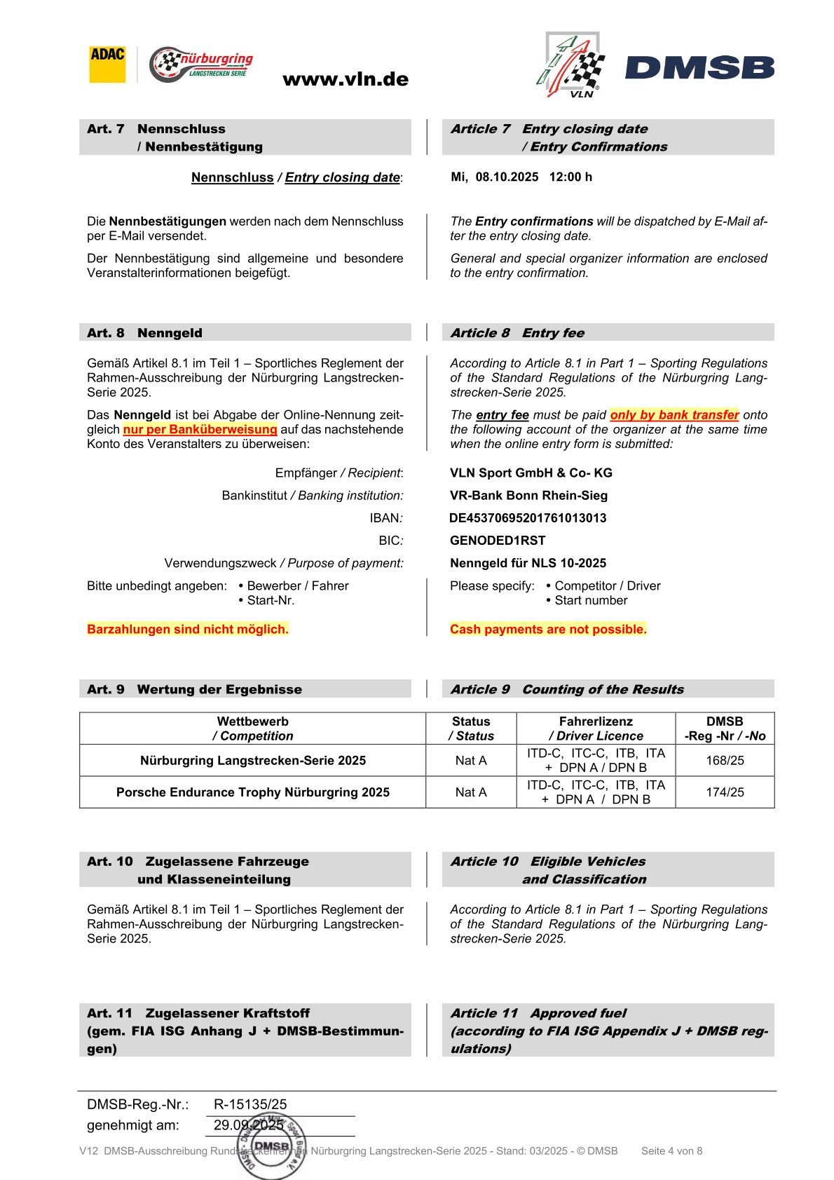 - Nevezési díj fizetése: Kizárólag banki átutalással a VLN Sport GmbH & Co. KG, VR-Bank Bonn Rhein-Sieg részére (IBAN: DE45370695201761013013, BIC: GENODED1RST). Készpénzes fizetés nem lehetséges.
