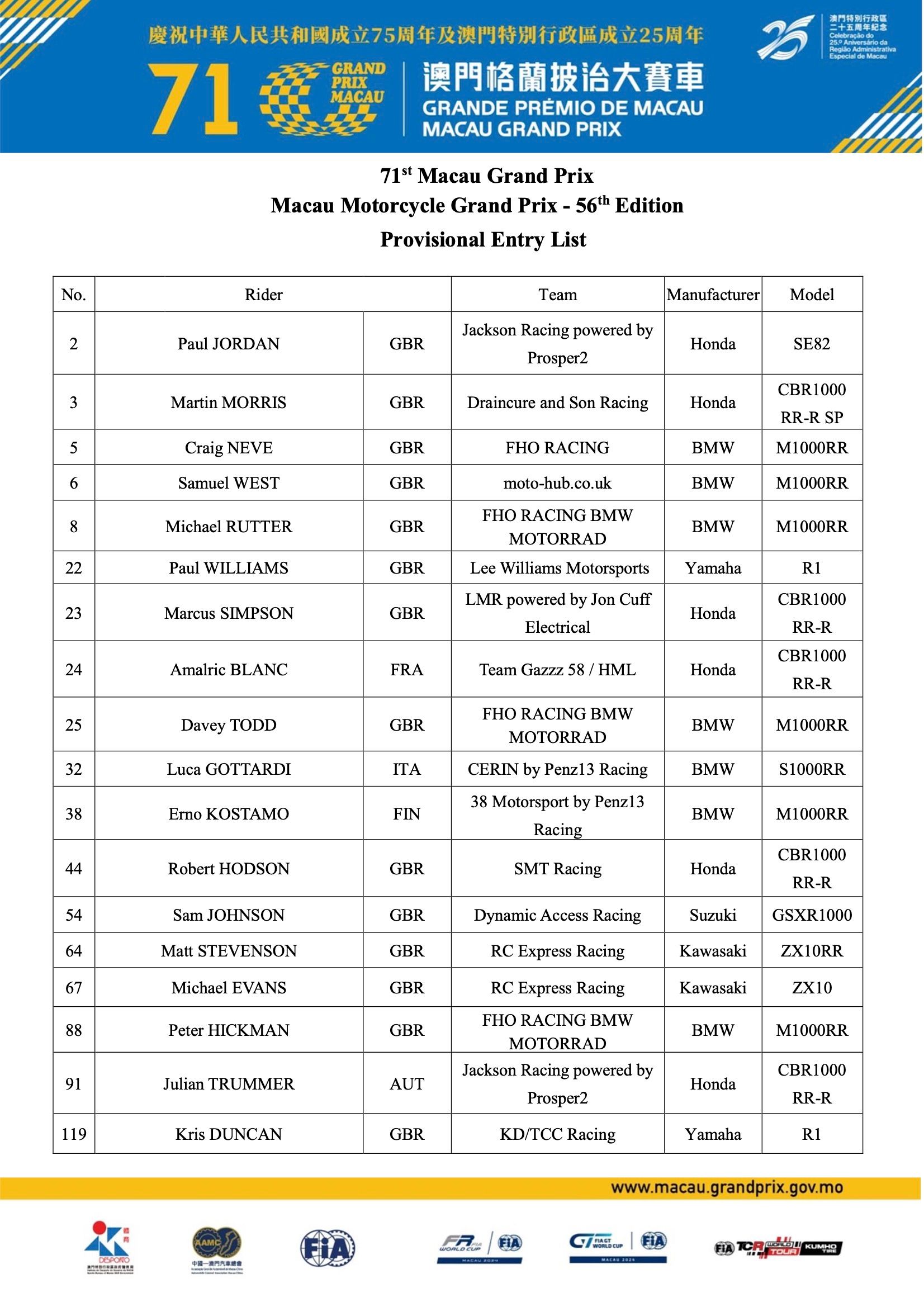 Grand Prix Sepeda Motor Makau ke-71Grand Prix Sepeda Motor Makau - Daftar Peserta Sementara untuk Balapan ke-56