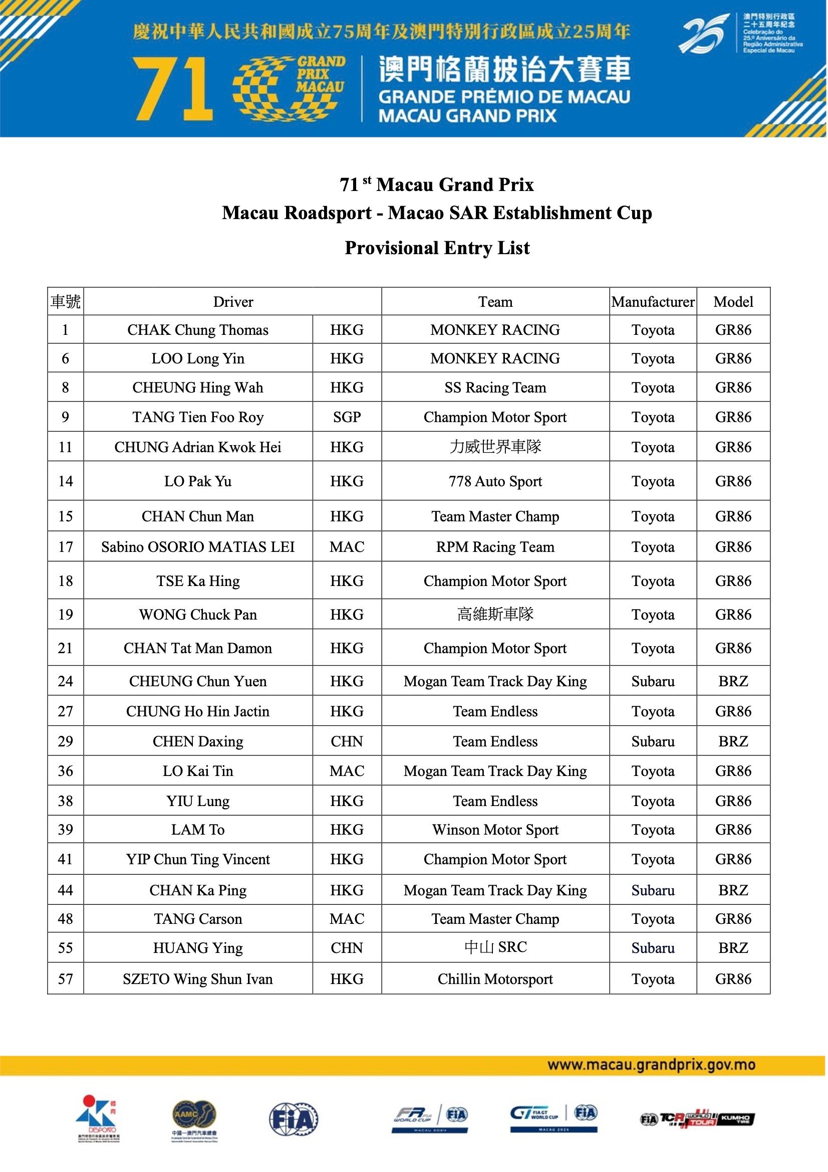 Grand Prix Makau ke-71 Olimpiade Makau - Daftar Sementara Piala Daerah Administratif Khusus Makau