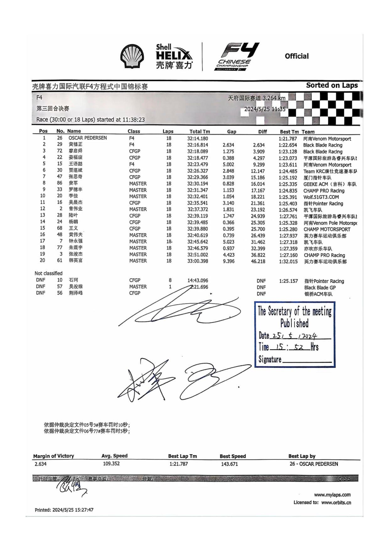 Risultati Gara 3 del Campionato Cinese FIA F4 24-26 maggio Circuito Internazionale di Chengdu Tianfu