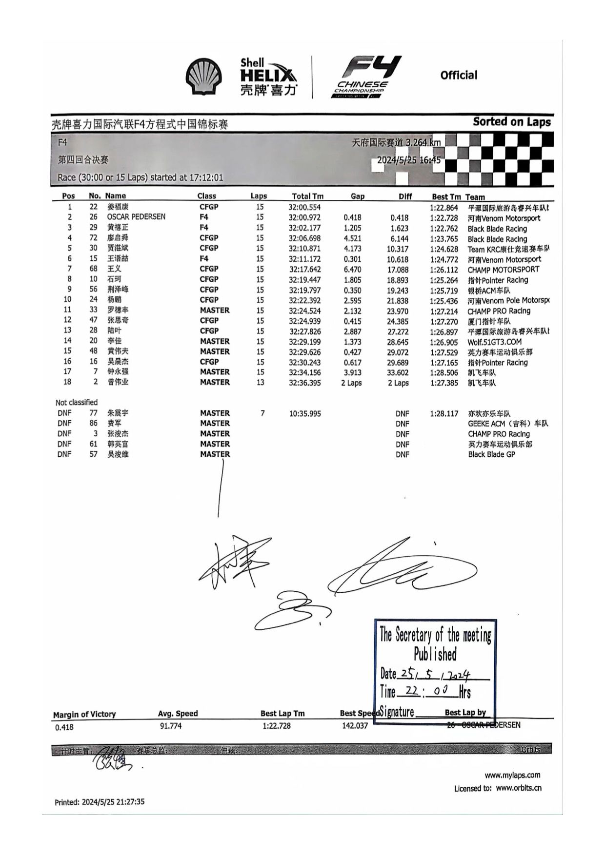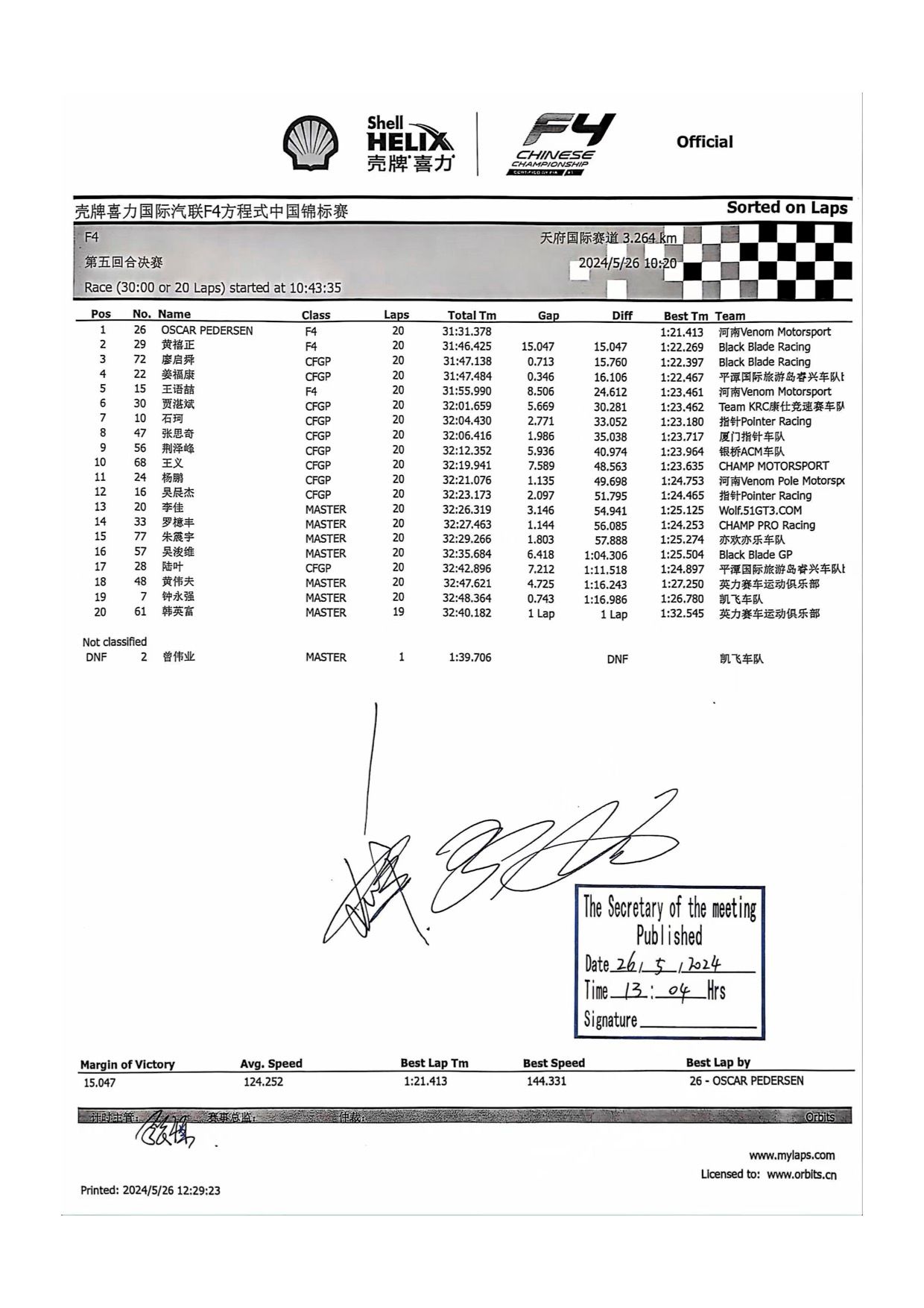 Risultati Gara 5 del Campionato Cinese FIA F4 24-26 maggio Circuito Internazionale di Chengdu Tianfu