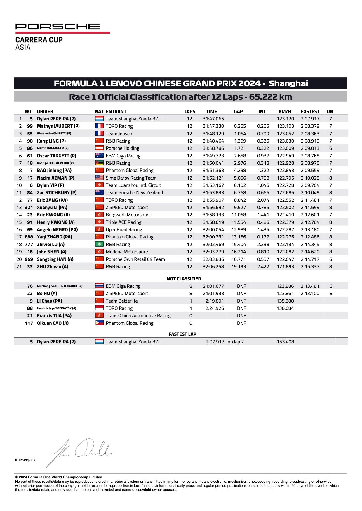 Risultati ufficiali della Porsche Carrera Cup Asia 2024 Shanghai Round 1 e 2 Gara 1