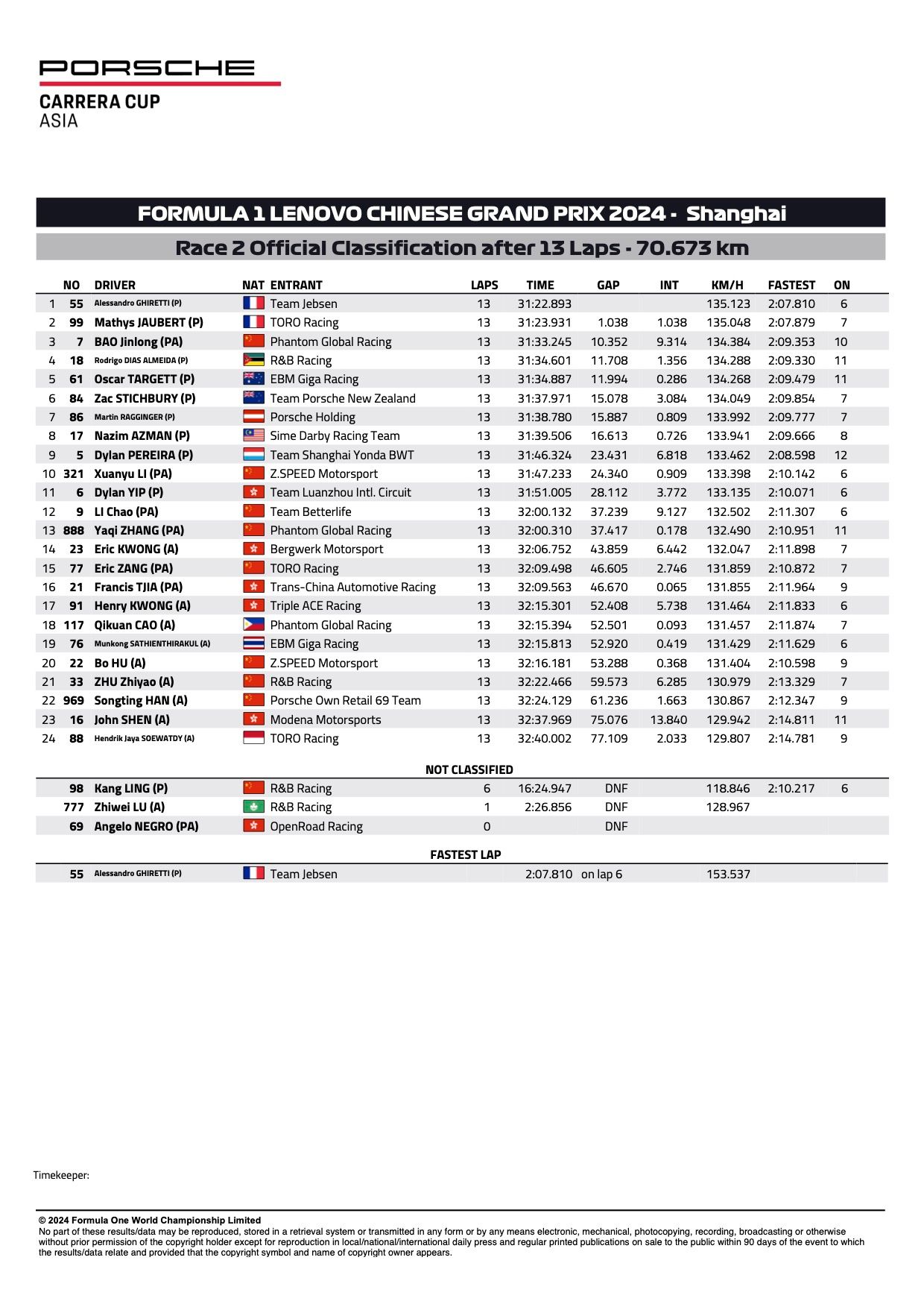 Risultati ufficiali della Porsche Carrera Cup Asia 2024 Shanghai Round 1 e 2 Gara 2