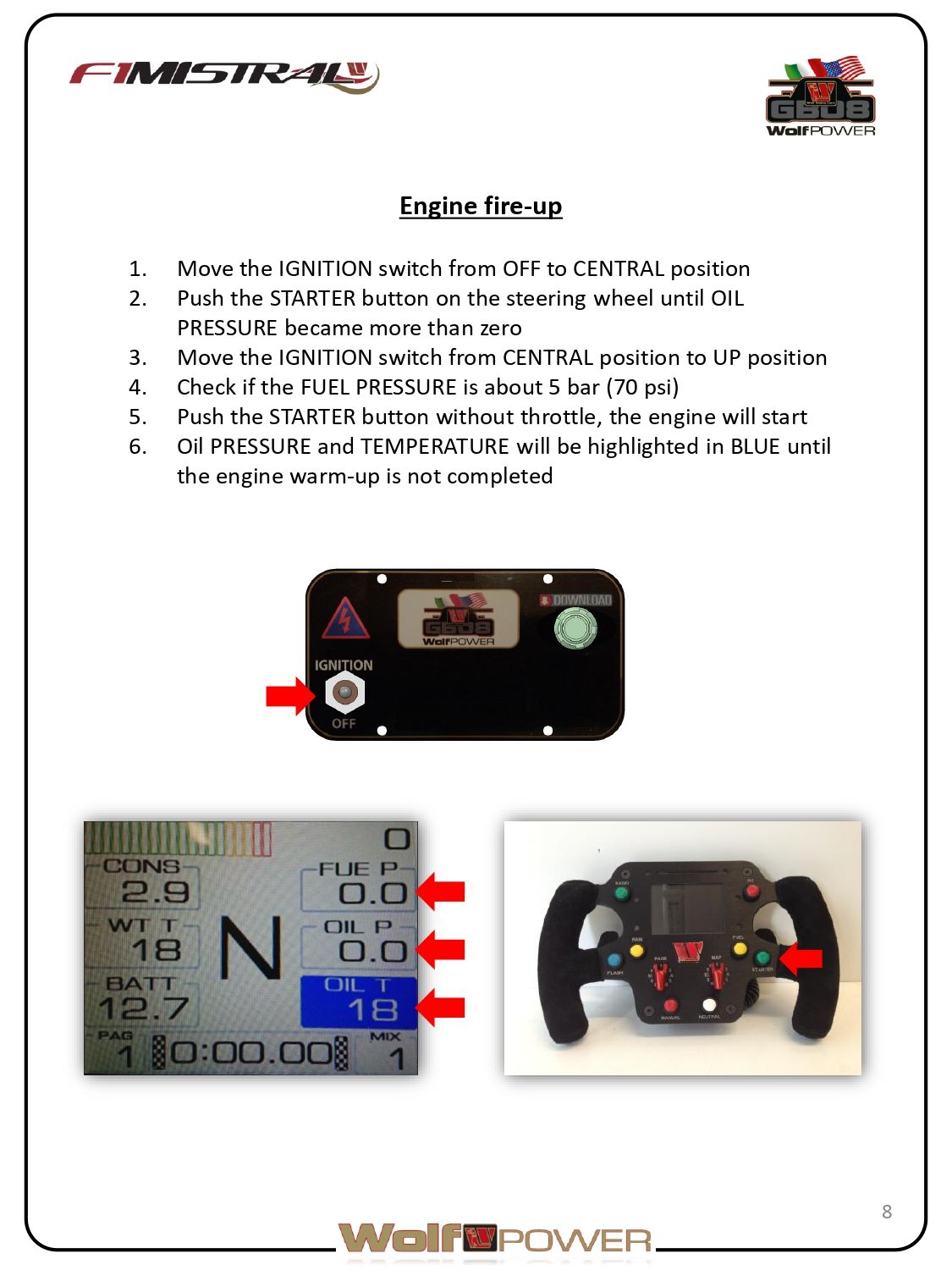 - Panduan langkah demi langkah untuk menghidupkan enjin, termasuk memeriksa tekanan minyak dan tekanan bahan api.