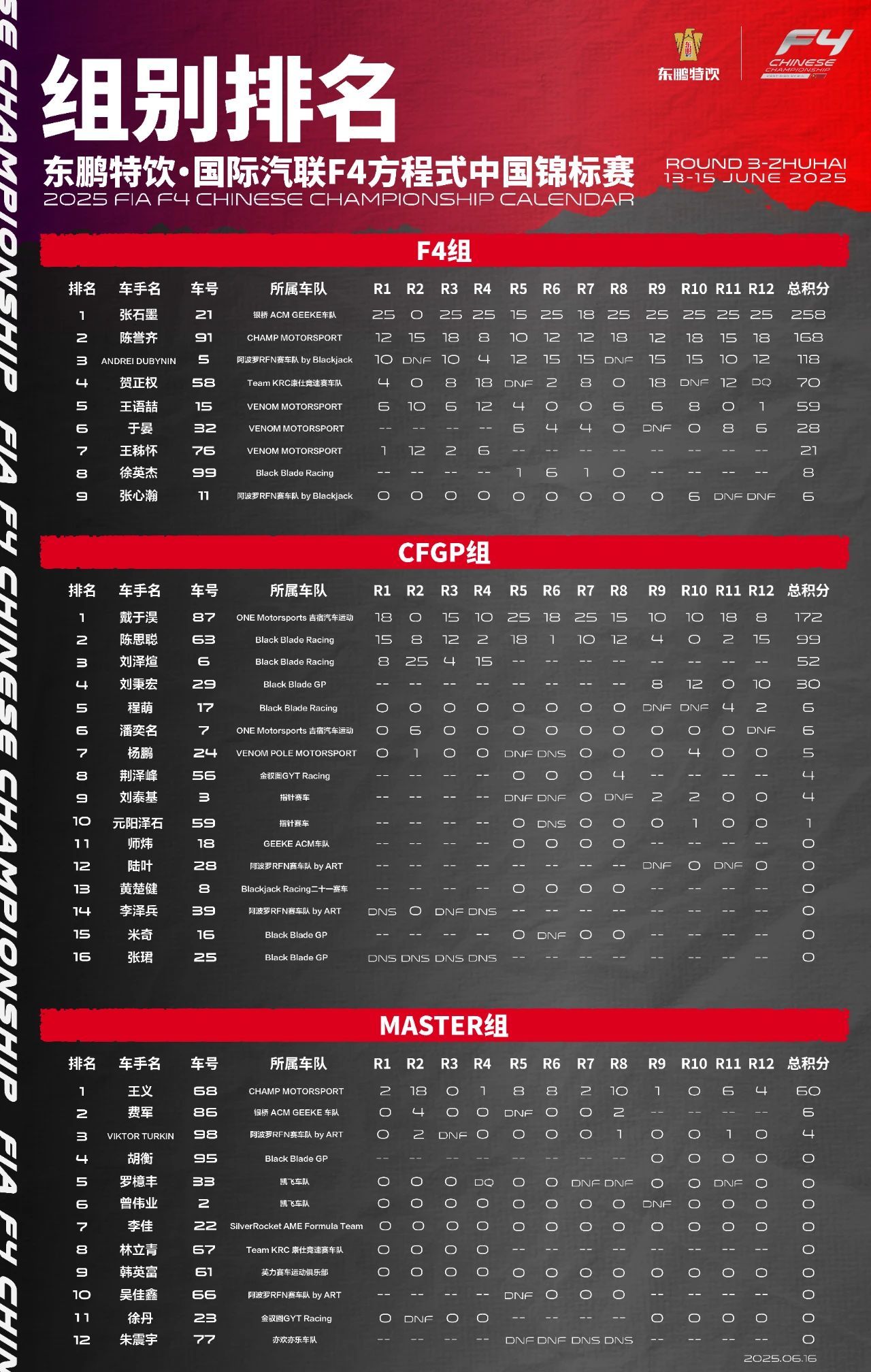 Dari 13 hingga 15 Jun 2025, perhentian ketiga Kejuaraan Formula China F4 Minuman Istimewa Dongpeng FIA telah diadakan di Zhuhai. Selepas acara itu, mata pemandu, mata pasukan dan kedudukan kumpulan baru dikeluarkan, menunjukkan keputusan saingan yang sengit.