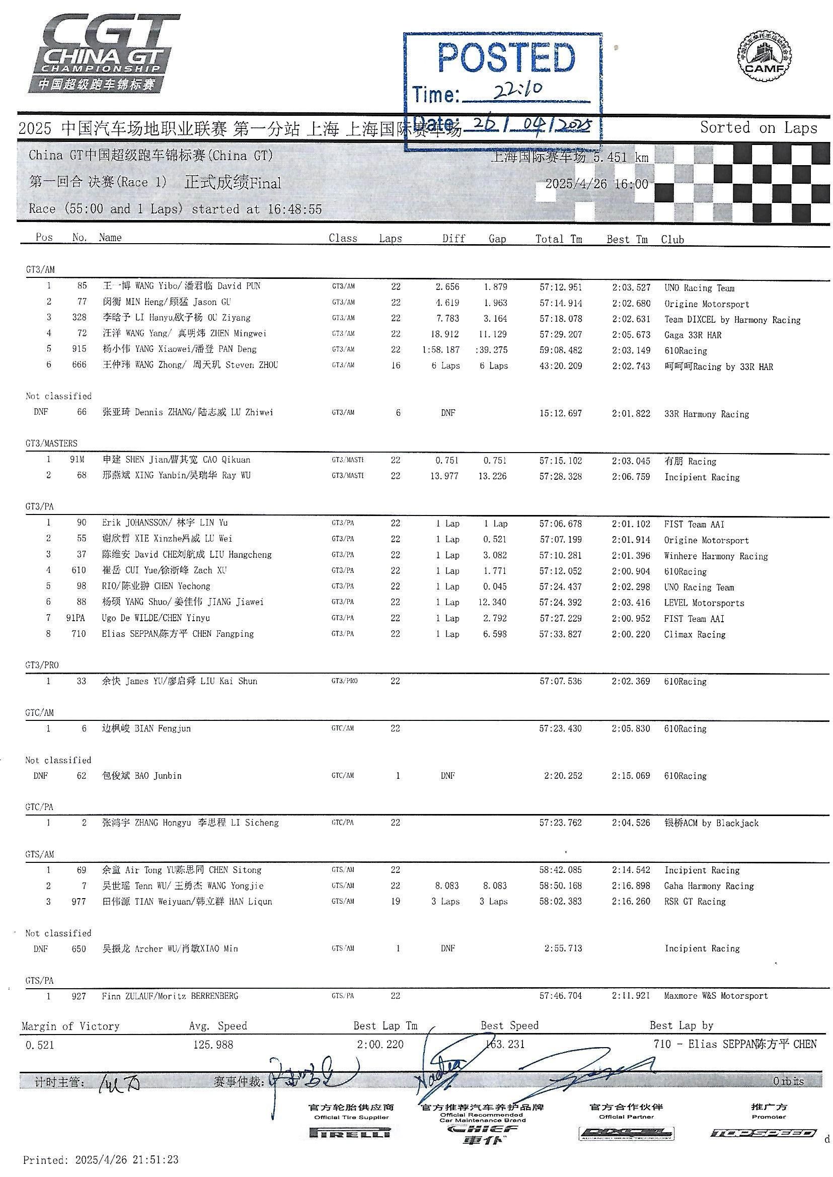 CGT China GT Shanghai runde 1/runde 2 offisielle resultater
