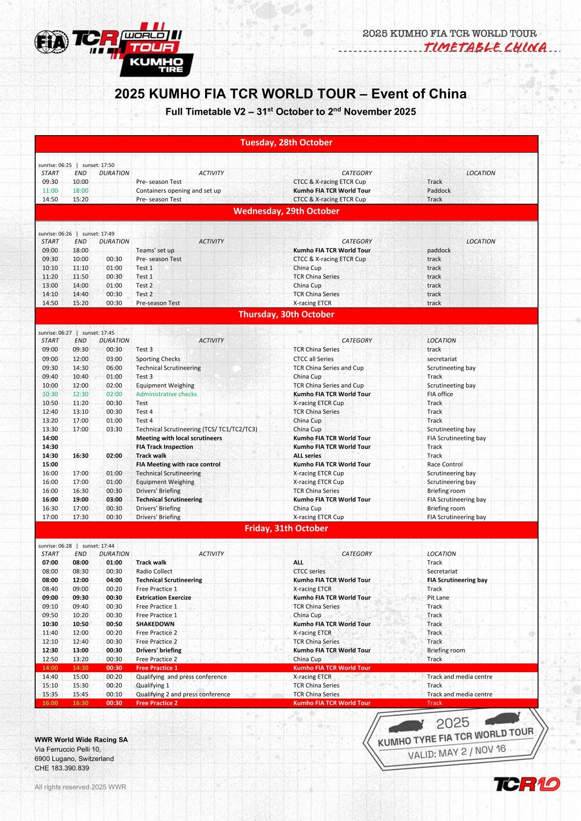 Pełny harmonogram 2025 KUMHO FIA TCR WORLD TOUR w Zhuzhou