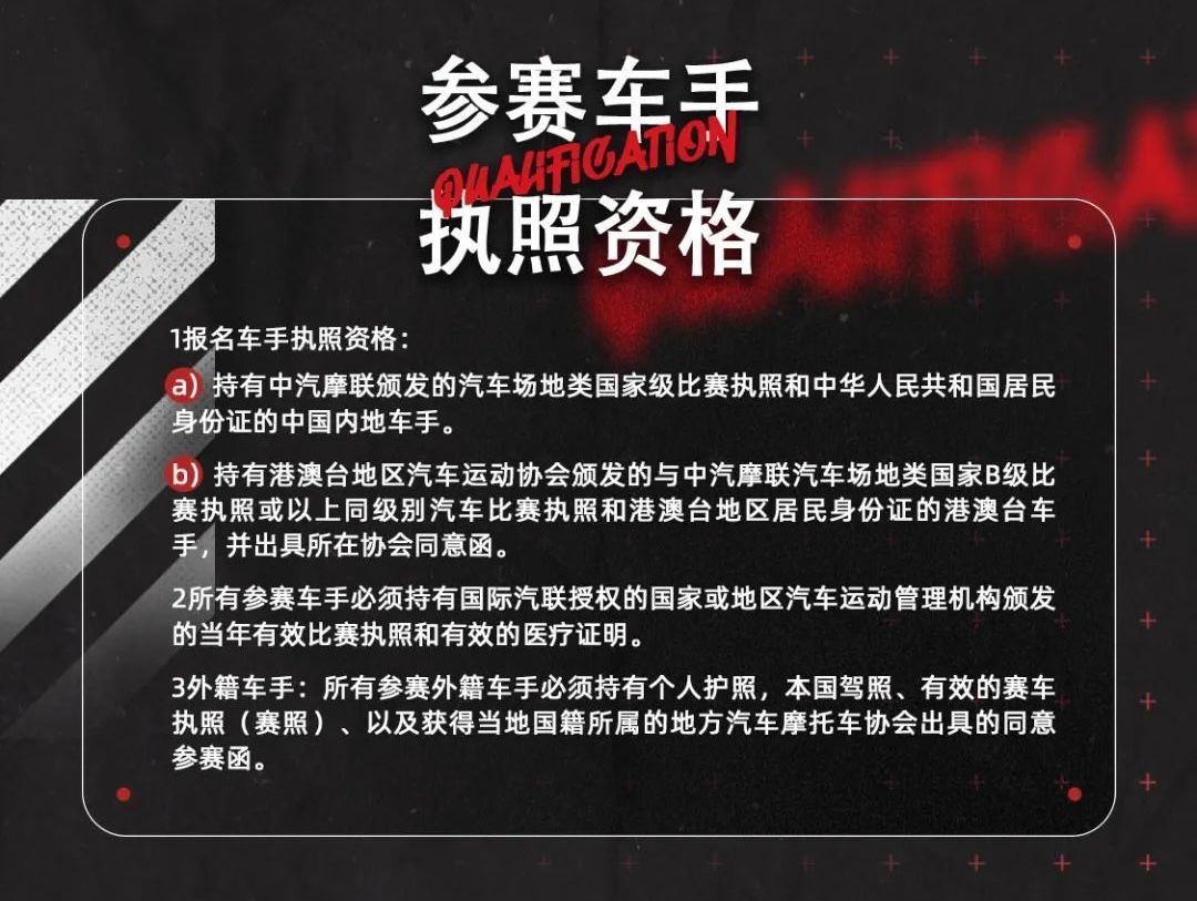 กิจกรรมนี้เปิดให้กับผู้ขับขี่ที่มีใบอนุญาตที่มีคุณสมบัติเหมาะสม ในจำนวนนี้ ผู้ขับขี่ในแผ่นดินใหญ่จะต้องถือใบอนุญาตแข่งขันรถยนต์ทางเรียบระดับชาติที่ออกโดยสหพันธ์ยานยนต์แห่งประเทศจีน และบัตรประจำตัวประชาชนของสาธารณรัฐประชาชนจีน ผู้ขับขี่จากฮ่องกง มาเก๊า และไต้หวัน จะต้องถือใบอนุญาตแข่งขันรถยนต์ทางเรียบระดับชาติระดับ B ของสหพันธ์ยานยนต์แห่งประเทศจีน หรือใบอนุญาตในระดับเดียวกันหรือสูงกว่า และบัตรประจำตัวประชาชนของฮ่องกง มาเก๊า และไต้หวัน และต้องแสดงจดหมายยินยอมจากสมาคม ผู้ขับขี่ชาวต่างชาติจะต้องถือใบอนุญาตแข่งขันที่ถูกต้องและเอกสารประกอบที่เกี่ยวข้องที่ออกโดยหน่วยงานที่ได้รับอนุญาตจากสหพันธ์ยานยนต์ระหว่างประเทศ