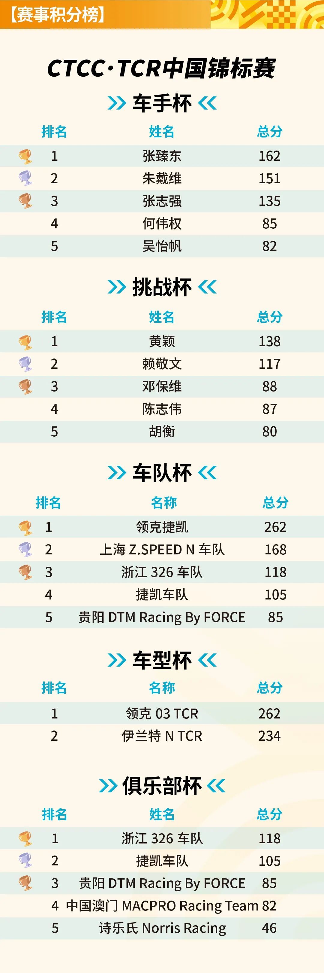 Trong nhóm TCR, đội số 21 của Zhuzhou Jirenziyoutianxiang là Han Chang/Jin Qiang dẫn đầu với lợi thế 30 điểm. Tuy nhiên, đội đua số 77 của Ningbo Jinyutu GYT Racing là Wang Honghao/Tu Yat, xếp thứ hai, chắc chắn sẽ tranh giành điểm tại Trạm Shaoxing Keqiao.