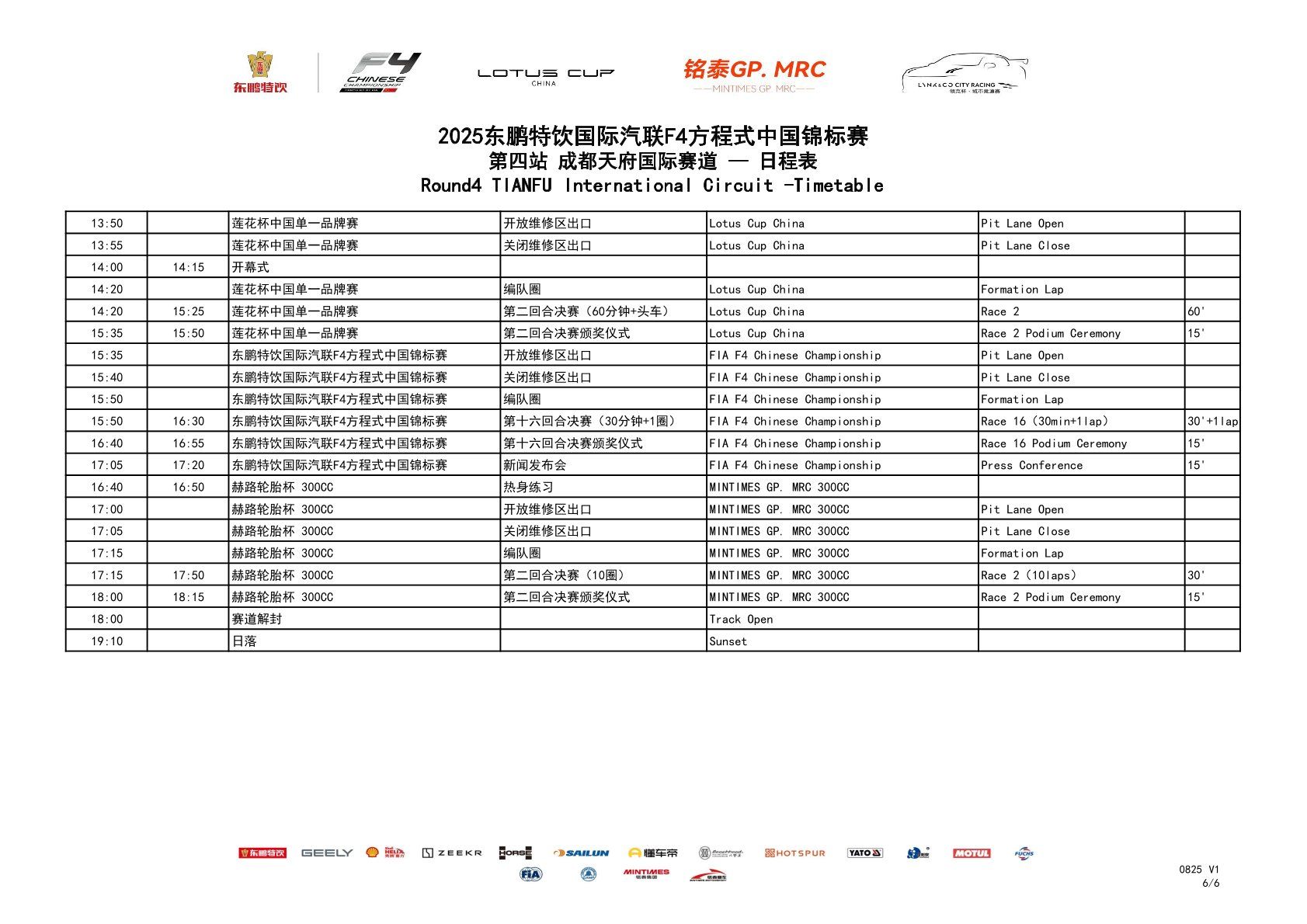 |10:05-10:45|รอบสุดท้าย 15 (30 นาที + 1 รอบ)|การแข่งขันชิงแชมป์ FIA F4 ชาวจีน เรซที่ 15 (30 นาที + 1 รอบ)|30 นาที + 1 รอบ|